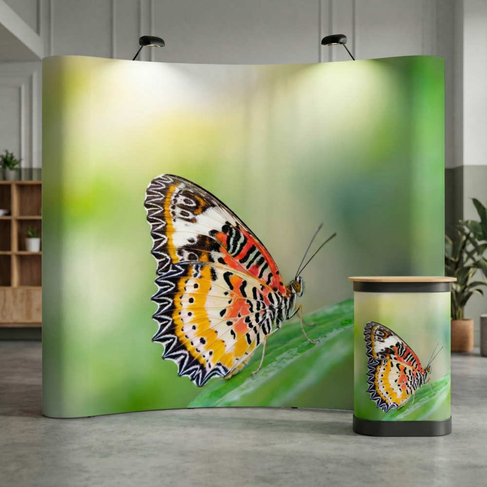 The classic Pop Up Wall, complete with counter. The graphics are attached to the aluminium structure with magnetic strips. Semi-rigid plasticised PVC panels.