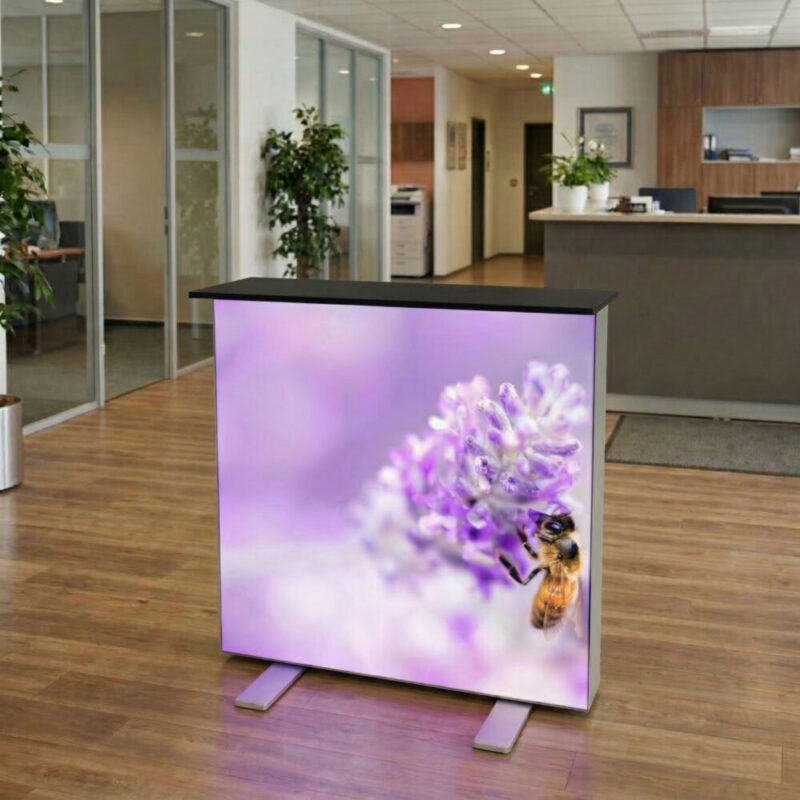 Alternativa retroilluminata ai Desk standard: attirate maggiormente l’attenzione in occasione di eventi e fiere con il nostro Banchetto retroilluminato Ouragan.